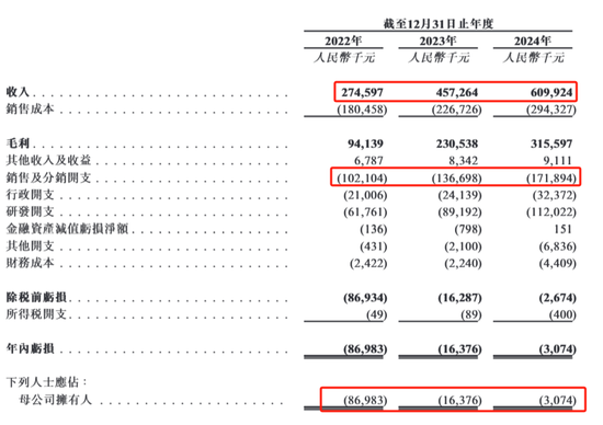 值得注意的是,公司营销支出较高,2024年销售及分销开支金额为1.72亿元,占同期收入的28.2%。